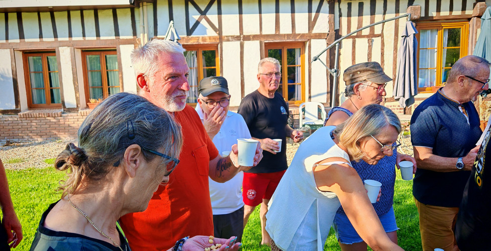 Samedi 12 juillet : Départ à 08h30. La troupe est ponctuelle et nous quittons Orgères pour emprunter l’autoroute de Normandie et avaler les 280km avant de rejoindre notre guide. Il est 12h00 lorsque nous arrivons à Toutainville (27). Cette fois-ci, toute la troupe est au complet et nous déjeunons chez « Toutain Régal » un petit restaurant bien sympa.