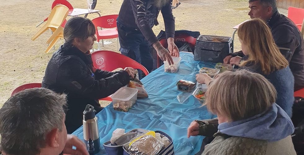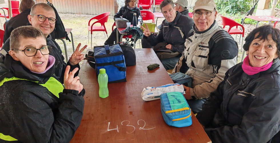 Nous avons prévu de pique-niquer et commençons par nous installer sur les tables sous les arbres, mais une soudaine belle averse vient modifier nos plans. Heureusement un grand barnum monté près du Bar Restaurant met à l’abri la trentaine de motards humides…