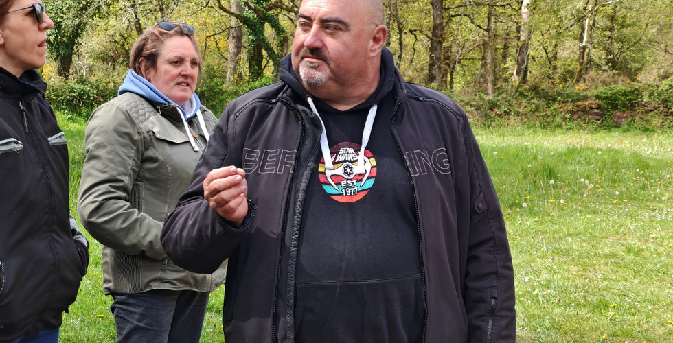 Un petit quart d’heure plus tard nous garons nos machines pour rejoindre le Château de Boutavent, niché sur un éperon rocheux en lisière de la mythique forêt de Brocéliande. Un lieu chargé d’histoire mais aussi de mystères. Aujourd’hui en ruines, ce château médiéval semble encore murmurer les récits d’un passé où réalité et légende s’entremêlent. Et dans le domaine, Jérôme est intarissable ! Il nous conte l’histoire du Château, de sa construction autorisée par les Druides et les Korrigans… L’histoire se mêle à l’imaginaire et notre guide nous conduit au travers du moyen âge à la rencontre des Rois, Reines, Chevaliers… Nous croisons les Plantagenet, Richard Cœur de Lion, Jean sans-terre, Blanche de Castille.