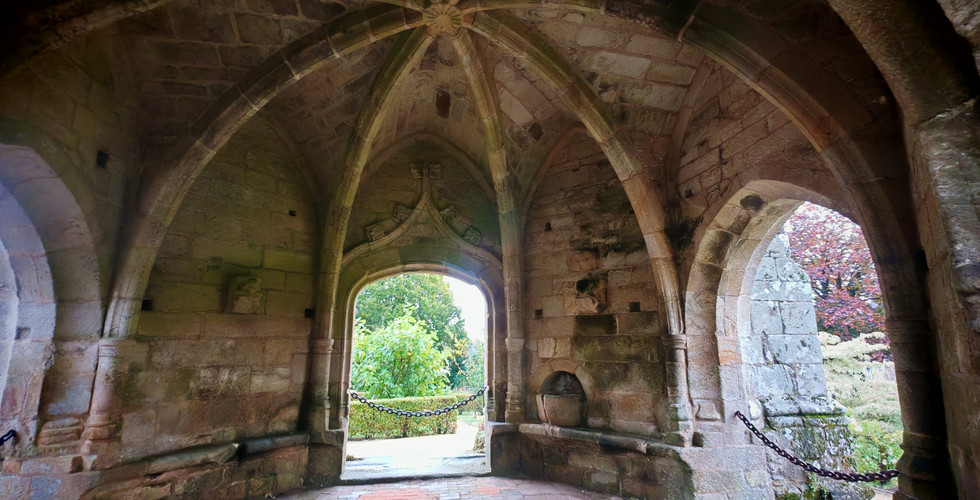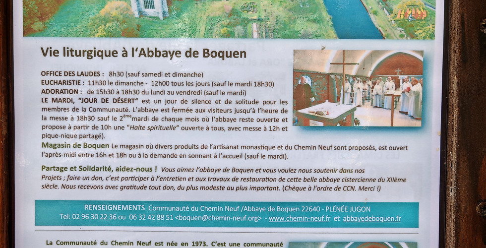 Nous nous dirigeons ensuite vers l’Abbaye de Boquen, située à l’orée de la forêt de Plénée-Jugon, fondée au XII siècle et détruite en grande partie pendant la révolution française. En 1936, l’abbaye abandonnée est découverte et réinvestie par Dom Alexis, (tiens un autre Dom...) moine cistercien, qui en fait un foyer spirituel. L’abbaye est restaurée au prix d’efforts considérables. En 1938, elle est classée monument historique. De 1976 à 2010, à l'appel de l'église la communauté des sœurs de Bethléem vit à Boquen. Depuis janvier 2011, elle est remplacée par la Communauté du Chemin Neuf.