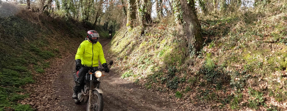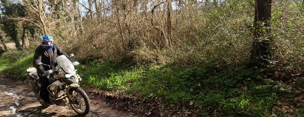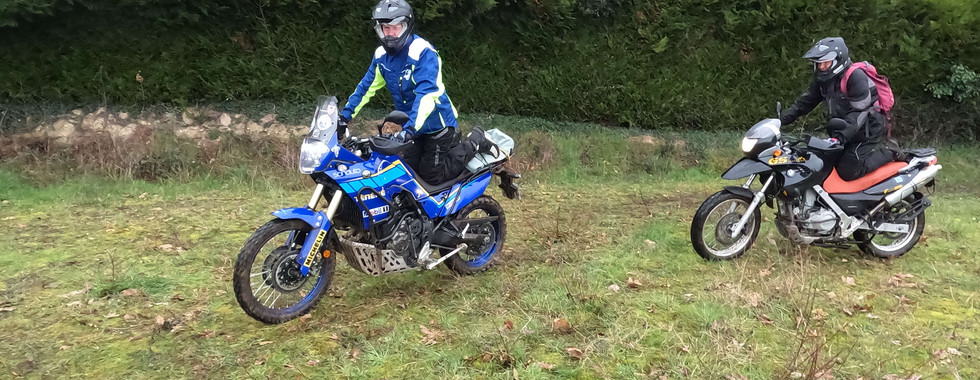 Le samedi matin nous nous sommes retrouvés au Kyriad de Beaucouzé, puis direction un petit terrain sur lequel nous avons fait nos premiers tours de roue hors bitume. Après un briefing et quelques explications sur les équipements (pour la moto et pour le pilote) indispensables à cette activité, nous avons commencé quelques exercices afin de sentir les sensations de la moto. En premier lieu un tour de la moto débéquillée à pied pour sentir son point d'équilibre. Après nous avons fait des ronds sur un terrain de plus en plus gadouilleux à chacun de nos passages, toujours debout qui est la position en off-road. Ensuite avec un genoux sur la selle, puis l’autre genoux, enfin les 2 genoux sur la selle, puis les deux jambes du même côté de la moto (à droite puis à gauche) et enfin un slalom pas si serré mais au vu du terrain pas si facile que ça.