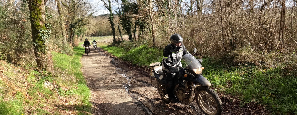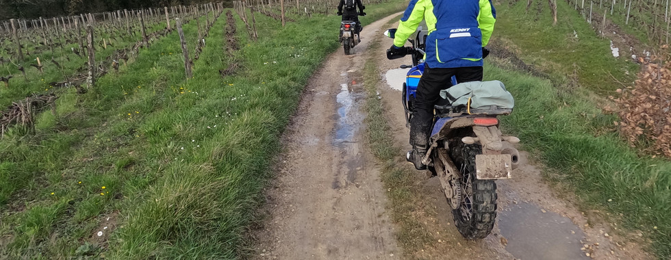 Après cet apprentissage nous avons commencé la randonnée à travers les vignes et chemin du Maine et Loire, environ 60% de off-road. La mise en application se fait bien et le rythme de roulage s'améliore au fil des kilomètres. Les première difficultés arrivent, de la boue, un passage à gué bétonné et donc bien glissant, et c’est la chute… Moto et pilote dans l’eau, Sylvain va passer le reste de la journée mouillé.