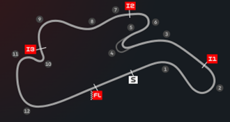 Caractéristiques : 5.54km / 16 mètres de large / Ligne droite la plus longue 920 mètres / 10 virages à droite & 5 à gauche