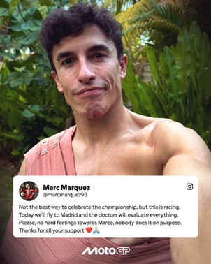 Une course mouvementée : Comme la veille, Marco Bezzecchi (Aprilia Racing) manque son départ et se montre offensif sur ses adversaires pour tenter de remonter. Au virage 7, l'Italien se retrouve aux prises avec Marc Márquez (Ducati Lenovo Team) mais se rate et percute son vis-à-vis, ce qui envoie les deux hommes dans le bac à gravier à haute vitesse dès le premier tour. Le pilote Aprilia se relève sans trop de problème tandis que le Champion du Monde se tient l'épaule et sera évacué à l'hôpital le plus proche. Le premier diagnostic parle d'une éventuelle fracture de la clavicule. On apprendra plus tard que Marc Marquez ne participera pas au deux prochains grands prix… Heureusement pour lui que le titre est déjà en poche depuis le grand Prix du Japon sur le Circuit de Motegi !